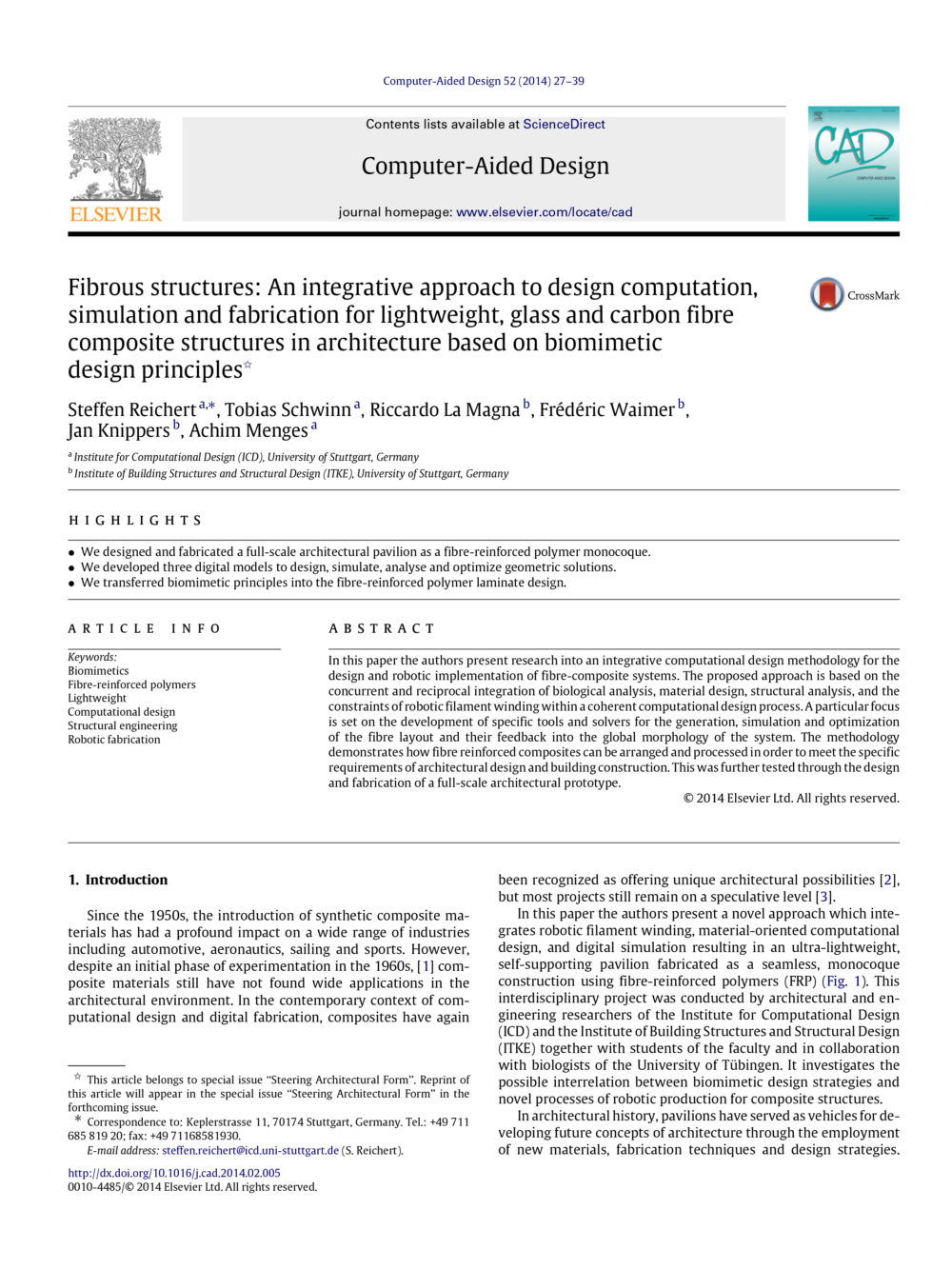 In this paper the authors present research into an integrative computational design methodology for the design and robotic implementation of fibre-composite systems. The proposed approach is based on the concurrent and reciprocal integration of biological analysis, material design, structural analysis, and the constraints of robotic filament winding within a coherent computational design process. A particular focus is set on the development of specific tools and solvers for the generation, simulation and optimization of the fibre layout and their feedback into the global morphology of the system. The methodology demonstrates how fibre reinforced composites can be arranged and processed in order to meet the specific requirements of architectural design and building construction. This was further tested through the design and fabrication of a full-scale architectural prototype.
